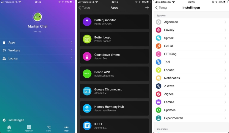 De Homey-app is gebruiksvriendelijk en gestructureerd ingericht. Alles heeft een logische plek, waardoor je snel kunt vinden wat je zoekt. Maar, je kunt ook zo diep in de instellingen duiken als je zelf wilt. Het Home-scherm biedt een overzicht van favoriete apparaten, favoriete Flows en belangrijke evenementen op een tijdlijn. Hier kun je dus bijvoorbeeld een apparaat direct activeren (voeg hem als favoriet toe) of een Flow direct starten. De tab Apparaten biedt een overzicht van alle gekoppelde smarthome-apparaten. Deze apparaten kun je zelf aan zones in huis toevoegen, bijvoorbeeld de woonkamer of slaapkamer. De derde tab heet Flows en is het deel waarmee je je huis kunt automatiseren. Hier maak je scenario’s/scene’s aan in de vorm van; als dit, dan dat. De laatste tab heet Meer en geeft je toegang tot de geïnstalleerde (en te installeren) apps, wekkers, Logica-elementen en alle instellingen van de Homey zelf. Bij die instellingen vind je onder meer het geheugengebruik van de Homey, het beheer van notificaties en locatie-instellingen, het toevoegen van gebruikers en de integratie van spraakassistenten.
