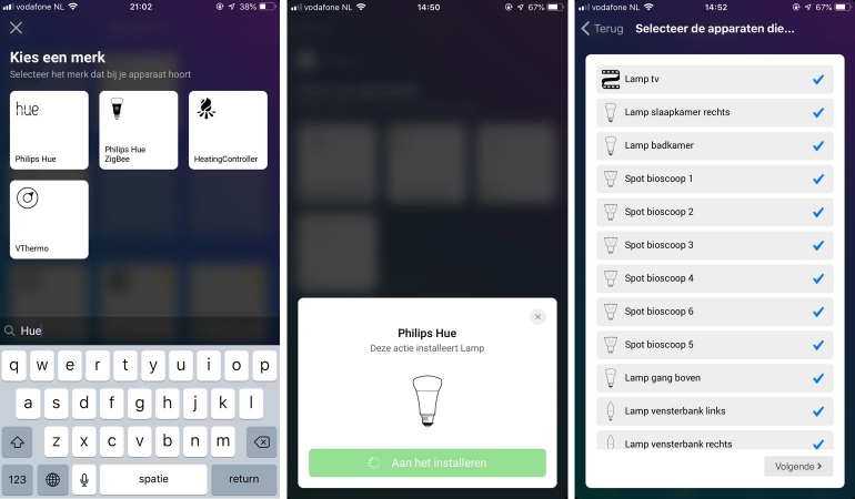 Wanneer je het product gekozen hebt dat je wilt toevoegen wordt (wanneer van toepassing) gevraagd om in te loggen bij die partij en toestemming te verlenen om toegang te krijgen tot jouw producten. Zodra dat gebeurd is wordt in jouw huis gezocht naar de producten en eenmaal gevonden worden ze in het overzicht van apparaten geplaatst. Niet alles wordt direct in de juiste zone/ruimte geplaatst, ook al heb je dit in bijvoorbeeld de Philips Hue-app al correct aangegeven. Je zult dus zelf de apparaten aan de juiste ruimte moeten toewijzen. In het geval van Philips Hue geldt ook dat alle scenes die op de Hue-hub staan gelinkt worden. Dit zijn ook oude scenes en scenes die door derden (bijvoorbeeld een alarm-app) aangemaakt zijn. En in ons geval zijn er naast de duidelijke, zelf aangemaakte scenes nog tientallen vage, oude scenes te zien. Dat maakt het wat onoverzichtelijk.
