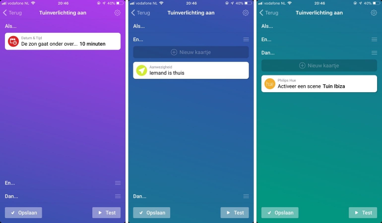 Een eenvoudige Flow is bijvoorbeeld; De zon gaat onder (als dit), dan gaat de tuinverlichting aan (dan dat). Je kunt dit nog verder specificeren door bijvoorbeeld aan te geven dat de lichten aangaan 10 minuten voordat de zon ondergaat en dat er bij het aanzetten van de verlichting een specifieke Hue-scene gebruikt wordt. Maar, heeft het aanzetten van de verlichting zin als je niet thuis bent? Nee, dus daar moeten we nog iets voor toevoegen in de ‘En’ kolom. Daar voegen we een kaartje voor Aanwezigheid aan toe, met de voorwaarde dat er iemand (maakt niet uit wie van de gebruikers, het moeten wel gebruikers zijn) thuis is. De Flow wordt dan; 10 minuten voordat de zon onder gaat (als dit) en er is iemand thuis (en dit), dan gaat de tuinverlichting aan met de Hue-scene Ibiza (dan dat). Dit is een vrij simpele Flow, maar het laat je wel zien wat de basismogelijkheden zijn. Je kunt de Flow zelfs testen voordat je hem activeren, door onderaan de Flow op ‘test’ te klikken. Het ‘dan dat’ gedeelte wordt dan voor je uitgevoerd zodat je het resultaat ziet.