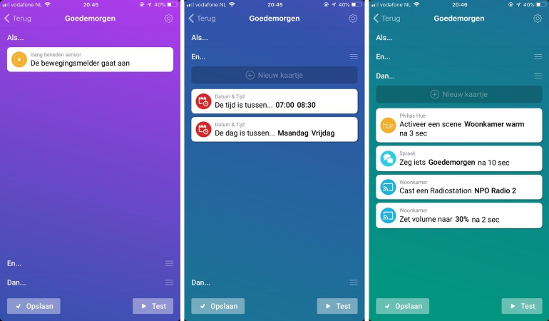 Een iets geavanceerdere Flow is de Goedemorgen-Flow die we aangemaakt hebben. Deze Flow wordt geactiveerd door de bewegingssensor van Philips Hue, die beneden in de gang hangt. Daar komt in de nacht niemand voorbij, maar de eerste persoon die opstaat in de ochtend wel. Wanneer die sensor dus een beweging waarneemt wordt de Goedemorgen-Flow gestart. We krijgen dan de volgende Flow: De bewegingsmelder gaat aan (als dit) en de tijd is tussen 07.00 en 08.30 op maandag t/m vrijdag (en dit), dan wordt de temperatuur naar 19 graden gezet (Nest), zegt Homey ‘Goedemorgen’, wordt NPO 2 radio gecast naar de speakers in de woonkamer en wordt het volume van die speakers op 30% gezet. Zoals je ziet kun je met meerdere kaartjes in het ‘dan dat’-gedeelte meerdere apparaten koppelen en een complete scene creëren.
