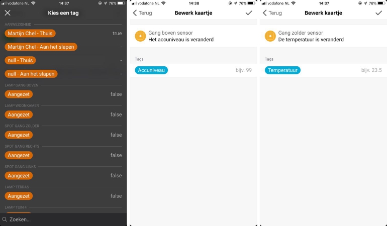 Hierboven heb ik het in een aantal voorbeelden al even aangekaart, maar je kunt dus ook met tags en variabelen gaan werken. De beginnende gebruiker zal zich daar nog niet aan willen branden, maar als je eenmaal ervaren bent in het maken van Flows en zelf ook wilt onderzoeken en leren bieden de tags en variabelen nog meer mogelijkheden om Flows te maken. Een tag is een specifieke regel die je aan een kaartje hangt. Bijvoorbeeld; de tag ‘temperatuur’ van de Hue bewegingssensor wordt door Homey direct aangemaakt wanneer de sensor gekoppeld wordt. Ditzelfde geldt voor de helderheid, het accuniveau, de CO2-waarde, etc van verschillende sensoren. De tag die aangemaakt wordt kun je vervolgens gebruiken om een Flow te maken. Als de temperatuur van de Hue sensor (als dit) onder de 17 graden komt, dan zet de thermostaat aan (dan dat).