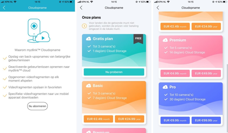 Laten we beginnen met het abonnement dat je bij deze camera kunt aanschaffen. Je kunt er namelijk voor kiezen om de SD-kaartlezer in de camera zelf te gebruiken – zonder abonnement – of een abonnement te nemen op cloudopslag. D-Link verlangt dus niet sowieso geld van je om de camera te gebruiken en bovendien is het basisabonnement gratis. Met dit abonnement kun je drie camera’s koppelen en wordt 1 dag aan opnamen in de cloud opgeslagen. Je kunt de opnamen altijd zelf nog downloaden. Het Basic-abonnement biedt ook ondersteuning voor 3 camera’s maar dan 7 dagen cloudopslag. Hiervoor moet 2,49 euro per maand of 24,99 euro per jaar betaald worden. Voor 5 camera’s en 14 dagen cloudopslag betaal je 4,99 euro per maand of 49,99 euro per jaar. Het Pro-abonnement laat je 10 camera’s koppelen en 30 dagen aan materiaal online opslaan. Hiervoor betaal je 9,99 euro per maand of 99,99 euro per jaar. Wij gebruiken het gratis abonnement in deze review.