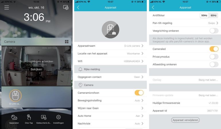 De app is zoals gezegd niet de meest overzichtelijke smarthome-app die we ooit gebruikt hebben, vooral omdat er zoveel wegen naar hetzelfde leiden. Daarbij is onze app een aantal keer gecrasht en verliest de camera regelmatig verbinding met de app, wat alleen op te lossen is door de app opnieuw op te starten. Ook duurt het soms heel lang voordat instellingen geladen zijn. Qua stabiliteit en gebruiksgemak is er dus nog zeker wat te winnen voor D-Link. Er zijn echter wel voldoende instellingsmogelijkheden om het functioneren van de camera naar eigen wens af te stellen.