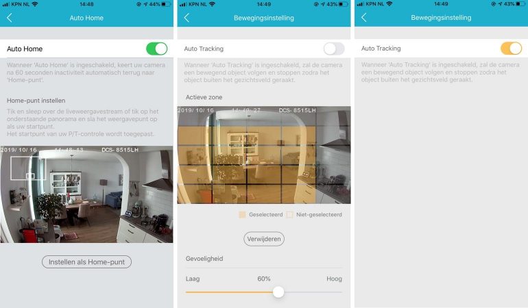 De bewegingsdetectie is ook ook vrij goed te noemen. De camera volgt personen zonder moeite door de ruimte, al gaat het hier en daar wat schokkerig. Ook keert de camera binnen 60 seconden terug naar zijn beginpositie (mits ingesteld). Het is jammer dat we de gevoeligheid in de auto trackmodus niet kunnen aanpassen, want ook lichtwisselingen en huisdieren leveren hierdoor een melding op. Zet je de automatische trackmodus uit dan kun je de gevoeligheid wel naar beneden bijstellen, wat minder foutieve meldingen oplevert. Ook kun je dan eenvoudig bepaalde delen van het beeld uitsluiten. In de live-weergave kun je de camera ook eenvoudig zelf bedienen. Dit doe je door op de panoramafoto op een specifiek punt dat je in beeld wilt te klikken. Het duurt even voordat het beeld reageert (er zit een paar seconden vertraging in) maar in de basis werkt dit systeem naar behoren. Je kunt zo zelf je hele huis snel bekijken.