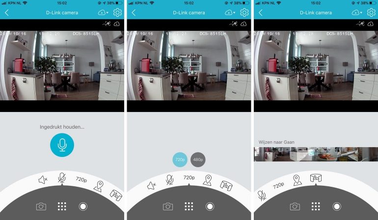Klik je er nogmaals op dan kom je in een scherm waarop je de liveweergave kunt aanpassen.Hier kun je een opname starten of een screenshot maken, je kunt de audio aan- of uitzetten en je kunt de microfoon gebruiken om te praten tegen iemand die voor de camera staat. Ook kun je de resolutie aanpassen (max 720p), kun je vooraf ingestelde posities van de camera activeren en kun je de camera middels de eerder aangemaakte panoramafoto naar een specifieke positie sturen.