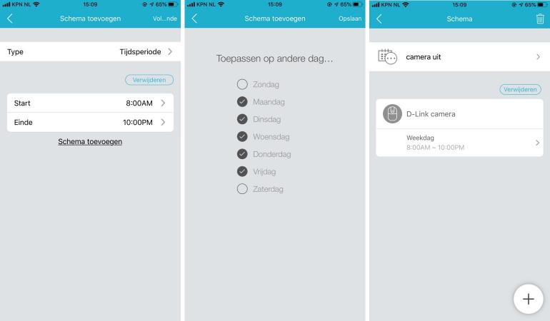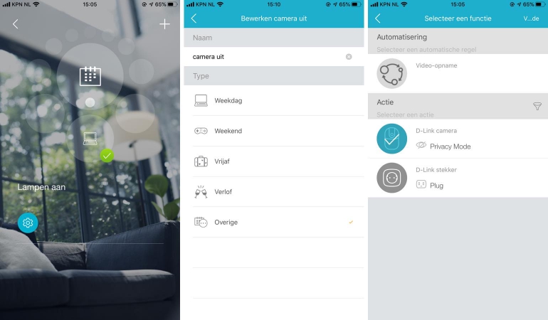 De volgende (of eigenlijk dus gekopppelde) optie is automatiseren. Dit gaat volgens het ‘als dit, dan dat’ principe en geldt binnen de app alleen voor de gekoppelde D-Link producten. De camera kan hierbij alleen als trigger (als dit) gebruikt worden. In ons geval hebben we een ook slim stopcontact van D-Link en kunnen we bij de ‘dan dat’ selecteren dat het stopcontact aangaat wanneer de camera een beweging ziet of een geluid detecteert. Je hebt ook de keuze uit het starten van een opname (staat ook automatisch ingesteld als je het gratis abonnement gebruikt) en het versturen van een push-melding. Tot zover werkt het prima, beperkt, maar prima. Willen we echter wat geavanceerder gaan automatiseren dan wordt het lastig. Ik zou namelijk graag willen dat de camera automatisch in privacy-modus gaat als ik thuis kom en automatisch rond middernacht weer aanspringt. Dat gaat niet want geofencing is iets wat D-Link nog steeds niet ondersteunt. Hiervoor ben je aangewezen op diensten als IFTTT, wat ook weer omslachtig is. Binnen de app kun je echt alleen met lokale input van camera’s en sensoren werken. En als je dan toch de camera wilt uitzetten als je thuis komt dan kan dat middels de handmatige One-Tap. Wil je de camera ’s nachts aan hebben staan dan maak je dus eerste een automatiseringregel aan die zegt dat de camera aanstaat en bij bewegingen opneemt. Vervolgens maak je bij schema’s een schema met deze automatiseringregel (die te selecteren is) als startpunt en geef je aan tussen welke tijden die regel mag gelden. Of, je maakt een schema met de camera zelf als startpunt en geeft de tijden aan waartussen de camera uit moet staan.