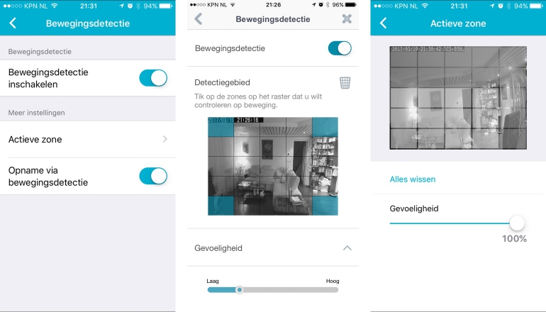 Het is prettig dat er in de app een privacymodus is. Tik op dat knopje en de camera stopt met beelden vastleggen. De gevoeligheid van zowel de bewegingssensor als de microfoon valt in te stellen. De microfoon begint echter pas met opnemen bij geluiden boven de 70 decibel, wat wij liever wat lager hadden gezien. Sluipende inbrekers zullen zo niet in de gaten lopen. De bewegingsdetectie is niet alleen qua gevoeligheid in te stellen, maar ook de gebieden waar wel en niet hoeft te worden gewaarschuwd, kunnen worden vastgelegd. Dat is handig als je bijvoorbeeld een druk borrelend aquarium in een hoek van de kamer hebt staan, die anders tot veel loze meldingen zou leiden. Als het je teveel wordt, kun je overigens ook de meldingen helemaal uitzetten. Maar dan wordt je huis dus niet meer beveiligd.