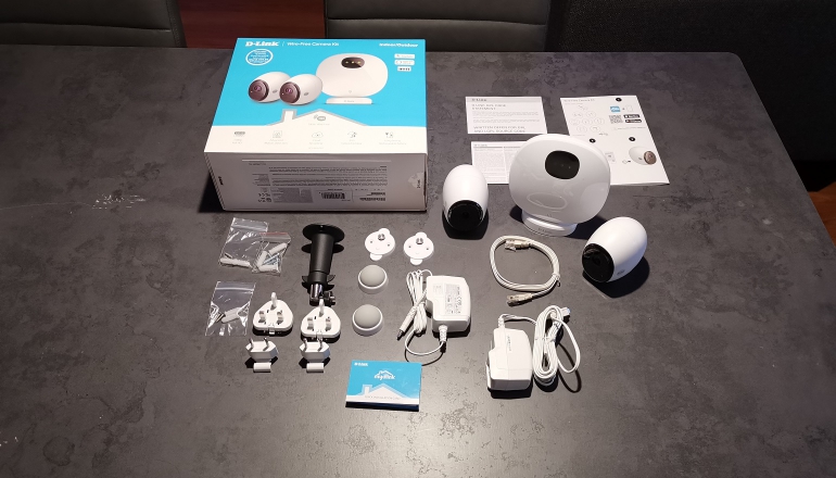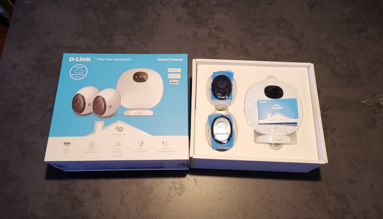 De doos komt met twee draadloze camera’s (DCS-2800LH), een wifi-hub (DCS-H100), twee mounting brackets met magneten voor binnen en een mounting arm voor buiten, stroom en internetkabel voor de wifi-hub en een oplader voor de camera’s. Tot slot vind je een kleine installatiegids in de doos.