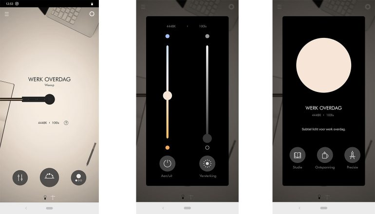 Tap je op de handmatige instellingen, dan krijg je twee sliders te zien. Met de linker slider beheer je de warmte, terwijl de rechter slider de helderheid instelt. Ook kun je hier de lamp snel in- en uitschakelen en eventueel de Versterking inschakelen (handig voor wanneer je extra licht nodig hebt). Met de knop rechts van het midden kun je snel kiezen uit modi als Ontspanning (waarmee je snel warm licht opwekt) en Studie (de helderheid krijgt hier dan de voorkeur). Ook kun je in de app zelf je eigen instellingen bepalen en opslaan.