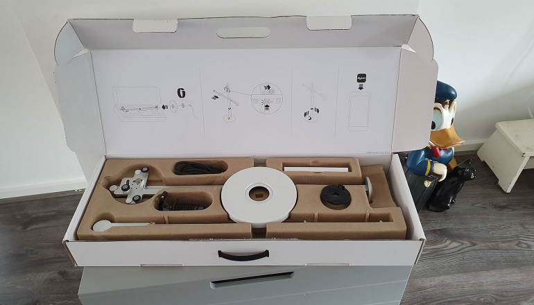 Wanneer je de doos van de Dyson Lightcycle opent, dan zie je in ƩƩn oogopslag alles dat je nodig hebt. Niet alleen zie je daar alle losse onderdelen van de lamp, ook staat op de zojuist open geklapte deksel een klein stappenplan met instructies voor het in elkaar zetten van de Lightcycle. Dit is gelukkig zo gebeurd, aangezien er maar weinig onderdelen zijn. Vervolgens kun je de gratis Dyson-app downloaden (dezelfde app als die van de luchtreinigingsventilators) en de stappen opvolgen die op je smartphonescherm verschijnen.
