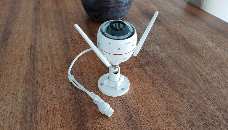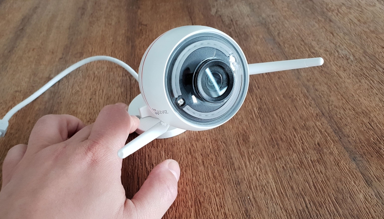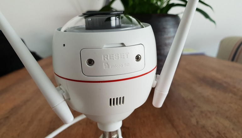 Daar waar veel buitencamera’s er ongeveer hetzelfde uitzien (grijs, rechthoekig en over het algemeen professioneel ogend), kiest EZVIZ voor een andere route. Dat deed het bedrijf in het verleden ook al voor de buitencamera’s, dus we zijn blij om te zien dat die weg opnieuw wordt ingeslagen. In plaats van een blok aan je muur te hangen, hang je nu een bolvormig object op en dat oogt net even wat prettiger voor het oog. Er zitten twee antennes aan, voor goed wifi, en de resetknop en micro-sd-kaartsleuf zitten achter een afgeschermd klepje.