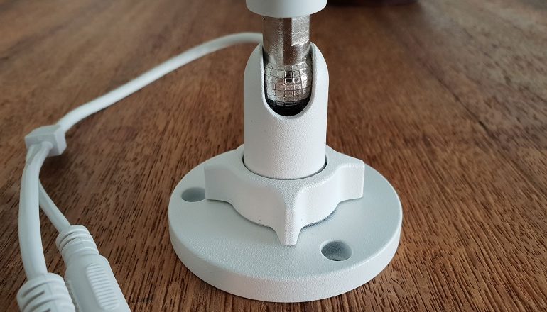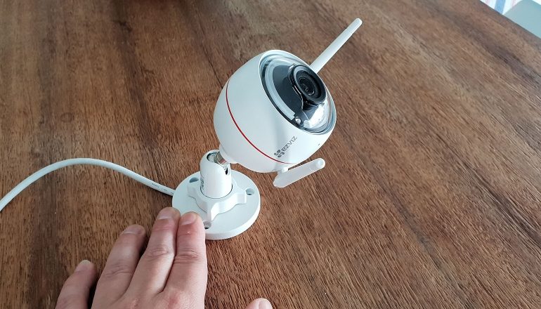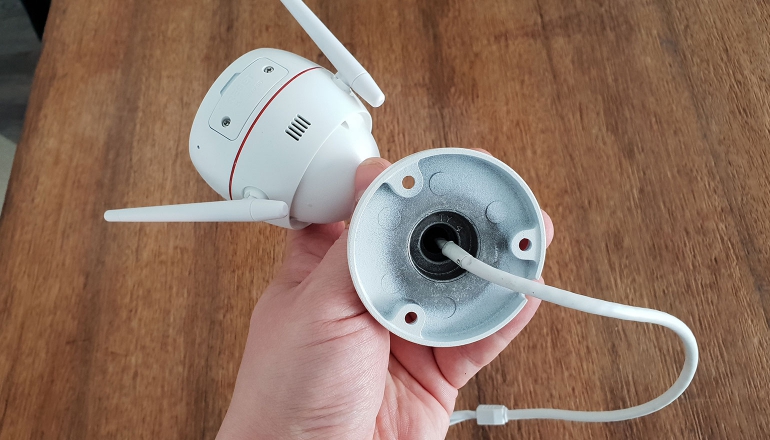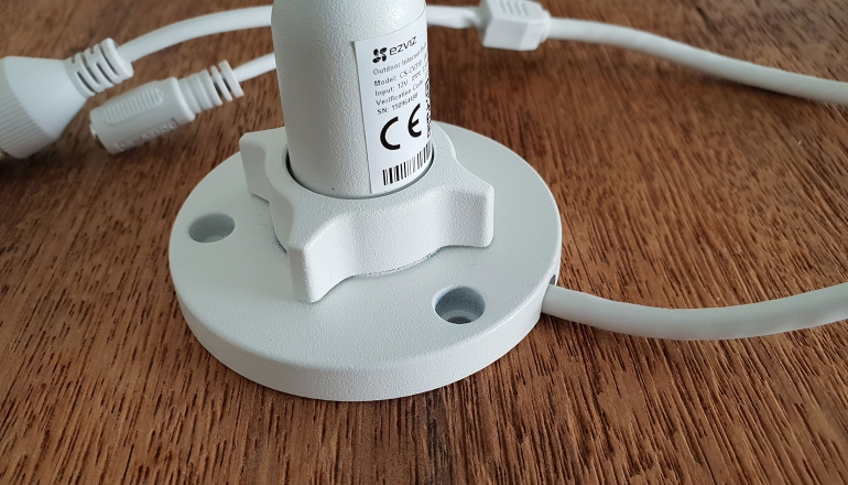 EZVIZ levert gelukkig wel een sterke constructie onder de camera. De voet en het scharnier waarmee je de camera plaatst, voelen en ogen stevig aan en krijg je ook echt niet gemakkelijk los — mocht iemand alsnog bij de camera komen. Het draad is relatief netjes weg te werken door het gat in de voet van de camera; dat gat kun je ook mooi gebruiken om te voorkomen dat je niet per ongeluk een schroef in het draad boort. Kortom: de fabrikant heeft aan allerlei dingen gedacht, behalve dus aan de lengte van de stroomkabel.