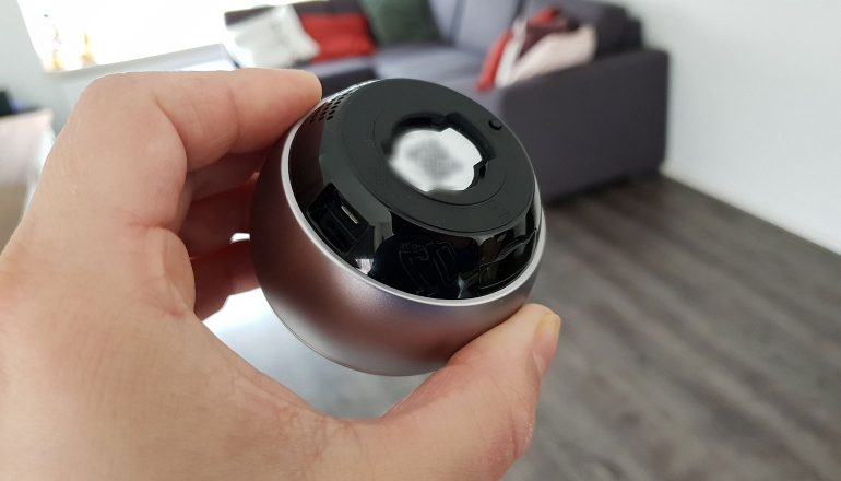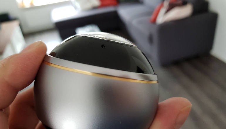 De EZVIZ Mini Pano heeft de vorm van een bol. In het zwarte gedeelte op de achterkant zit een speaker, terwijl in het zwarte gedeelte op de voorkant een microfoon zit. Daardoor is het mogelijk om met iemand te praten, terwijl je zelf niet thuis bent. Aan de onderkant van de fisheyelens zit een kleine led-indicator, die verschillende dingen kan laten zien. Als je een blauw lampje ziet dat op een rustig tempo aan en uitgaat, dan is er niets aan de hand. Mocht er een rood, flikkerend licht te zien zijn, dan is er iets aan de hand.
