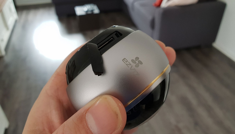 Tegenover de speaker op de achterkant, aan de andere kant van het slot voor de houder, zit een micro-sd-kaartlezer. Daar kun je een kaartje in doen van maximaal 128 GB. Helaas is het zo dat je dat kaartje nog wel los moet kopen, aangezien EZVIZ die niet standaard mee levert. Boven de opening op de achterkant zit de resetknop, die je met een dun object kunt indrukken. helemaal aan de onderkant zit een micro-usb-aansluiting, waar je de stekker in moet doen. De EZVIZ Mini Pano heeft geen ingebouwde accu en heeft dus altijd stroom nodig.