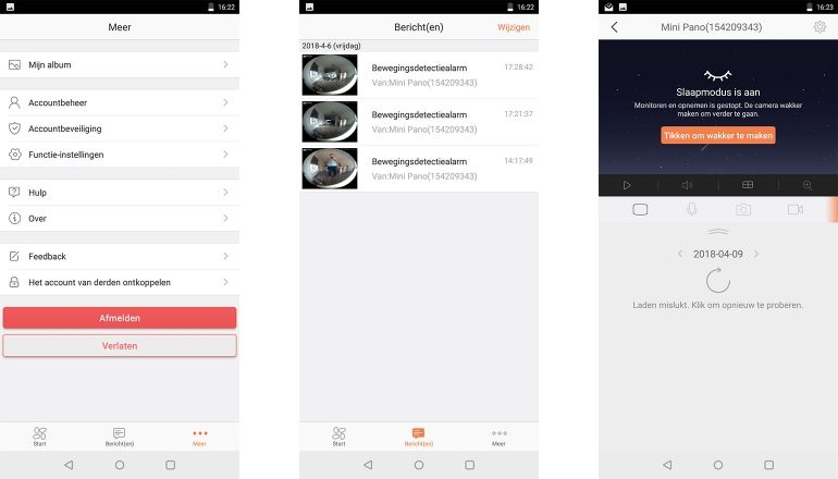 In het instellingenmenu van de gebruikte camera staan alle opties overzichtelijk in beeld gebracht, met hier en daar nog een extra uitleg voor functies die misschien niet zo voor zich spreken. Wat is bijvoorbeeld IR-licht? Wat wordt er bedoeld met Audio? De app legt het met enkele woorden uit, waardoor je vrijwel altijd weet wat je precies aan het doen bent. Wil je naar je meldingen gaan, dan moet je weer uit het menu van de camera en teruggaan naar het overzicht. Daar treft je dan de meldingen, video’s en foto’s aan van de bewegingssensor.