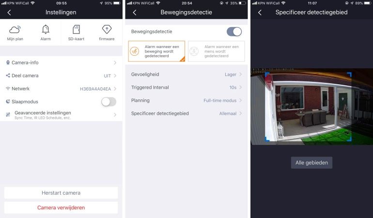 De camera reageert accuraat en redelijk snel op bewegingen die waargenomen worden, en je kunt dankzij de preroll-instelling zelf bepalen hoeveel seconden voor de detectie van een beweging opgenomen wordt. De live-feed is zonder vertraging te bekijken en zodra er een beweging waargenomen wordt heb je binnen 10 seconden – afhankelijk van de kwaliteit van de verbinding – een melding binnen. Wanneer je de camera met een LAN-kabel aansluit zal de melding sneller verschijnen dan met een draadloze verbinding, ook afhankelijk van de kwaliteit van je netwerk en de afstand van jouzelf tot de locatie. Daarna verschijnt er direct een screenshot bij het meldingenoverzicht en kun je de opname terugkijken vanuit de cloud, de gekoppelde NAS/computer of vanaf de SD-kaart. Vanuit het overzicht met alerts kun je alleen een screenshot bekijken maar het had fijn geweest als je vanuit dit overzicht ook direct naar de opname kon gaan. Nu moet je eerst terug naar de camera, op de tijdslijn klikken en naar het event gaan. Een ander minpuntje hier is dat de tijdslijn met opnamen soms niet bijgewerkt is met de laatste detecties. Je moet de app dan geforceerd sluiten en opnieuw opstarten, waarna de nieuwste detecties pas weergegeven worden en af te spelen zijn. Dit lijkt een bug en kan irritant zijn bij meldingen die je direct wilt bekijken.