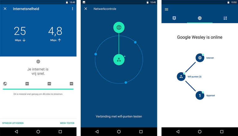 Het enige verschil tussen het instellen van de eerste puck en de tweede, is dat je bij de tweede keer het mesh-netwerk moet testen. Daar zal de app vanzelf melding van maken. Als het is goed geeft de app aan dat alles er goed uit ziet. Vervolgens krijg je de opdracht om het derde, en in ons geval laatste, wifi-punt in te stellen. Dat werkt op dezelfde manier als het instellen van Google Wifi 2: je voorziet de puck van stroom, zet hem op de uitgekozen plek en gaat terug naar de app om dezelfde stappen te doorlopen. Het kost slechts een paar minuten extra.