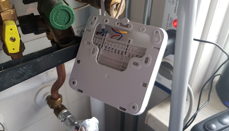 Wanneer je de juiste kabels hebt gekoppeld en het apparaat met de aan-uitknop hebt ingeschakeld, dan kun je naar je slimme thermostaat lopen. Zet hem alvast op de plek waar je hem wil hebben, zodat je meteen aan de slag kunt. Vervolgens stel je wat basale dingen in en doe je er goed aan alvast de applicatie te downloaden. Die neemt je door een aantal stappen — volg ze, toon wat geduld, en de thermostaat is aangesloten. Mocht het ‘afronden’ langer dan vijf of tien minuten duren, annuleer de installatie en begin dan opnieuw.