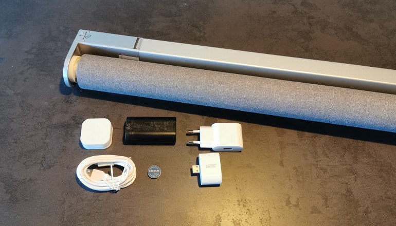 Wanneer je een slim rolgordijn van IKEA aanschaft krijg je het slimme rolgordijn, een oplaadbare batterij, een afstandsbediening, een lader en een signaalversterker meegeleverd. Je zult de slimme rolgordijnen dus af en toe zelf moeten opladen. Wees echter niet bang, want volgens IKEA hoef je dit slechts één keer per 4 tot 6 maanden te doen. Tijdens de testperiode heb ik de batterij dan ook geen één keer hoeven opladen. Je kunt het geheel prima met de meegeleverde afstandsbediening te bedienen. Wil je ook bediening met je stem of via de app? Dan zul je de Trådfri-hub van 32,95 euro tevens moeten aanschaffen.
