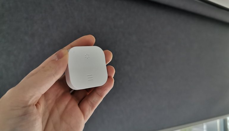 Naast de app kun je ook kiezen om de slimme rolgordijnen met de afstandsbediening te bedienen. Deze vierkante afstandsbediening is gemaakt van zeer degelijk plastic en voelt stevig aan. Een wandhouder wordt tevens meegeleverd. Deze kun je vastschroeven, maar ook vastplakken middels de meegeleverde 3M-tape. Op de remote heb je twee knoppen tot je beschikking om de slimme rolgordijnen omhoog of omlaag te doen. Eén keer drukken en de rolgordijnen gaan helemaal omlaag naar de eerder ingestelde maximumlengte. Druk je nogmaals op de knop, dan stoppen de rolgordijnen op de op dat moment ingestelde lengte. Ook de afstandsbediening werkt prima, maar stel je meerdere rolgordijnen in op één afstandsbediening, dan bewegen deze niet altijd tegelijk omhoog of omlaag. Onderbreek je dus de beweging halverwege, dan zullen de rolgordijnen niet altijd op dezelfde lengte hangen. Via de app kun je dit bijstellen en het is ook geen probleem als je de rolgordijnen helemaal omhoog of omlaag beweegt, maar wil je de rolgordijnen bijvoorbeeld 30 procent sluiten, dan hangen ze dus niet altijd gelijk wanneer je dit met de afstandsbediening doet.