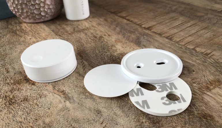 De kleine accessoire komt met een ronde bevestigingsplaat voor aan de muur, waartegen de afstandsbediening met magnetische achterzijde (of plakstrip) geplaatst kan worden. Je kunt de afstandsbediening echter ook zonder bevestigingsplaat op een bureau of kast zetten. Er zit een antislipring op waardoor de remote niet verschuift als je hem bedient. En tot slot kun je de remote dankzij de magneet aan de achterzijde nog op een metalen oppervlak plaatsen, zoals een koelkast. Plaatsingsopties genoeg dus.