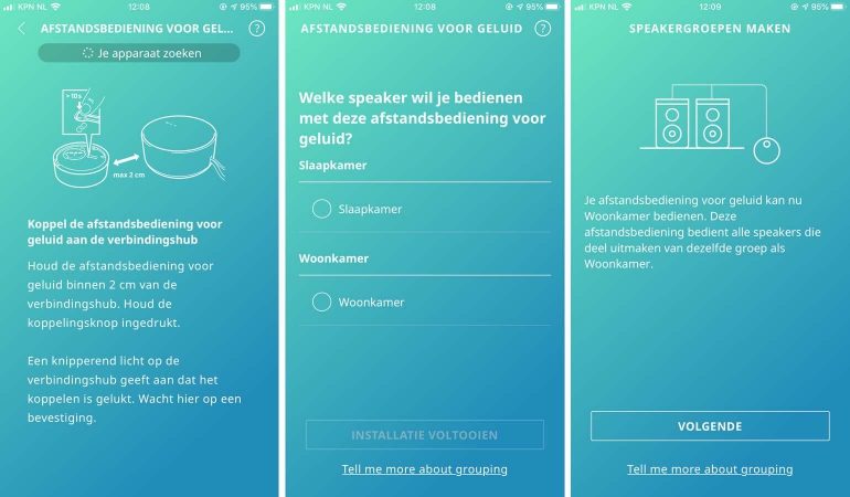 Wanneer je de afstandsbediening uit de doos haalt is het een kwestie van de meegeleverde knoopcelbatterij in de remote stoppen en de remote met de Trådfri-verbindingshub koppelen waardoor hij in de Home Smart-app verschijnt. Om de batterij te plaatsen moet je een heel klein schroefje verwijderen en daar eerst een passende schroevendraaier voor vinden. Het is niet de meest handige oplossing, maar eenmaal gevonden en geplaatst begint het koppelen met de Trådfri-verbindingshub. Alle stappen in de app eenmaal doorlopen kunnen we de Symfonisk-speakers koppelen aan de remote in de Home Smart-app. Dat gaat allemaal heel soepel. Je kunt in de app zelf zones aanmaken en met één remote kun je één zone of een groep speakers bedienen. Je kunt de afstandsbediening bijvoorbeeld koppelen aan alle speakers in de slaapkamer, of alleen die ene speaker in de keuken. Het maakt niet uit het een Symfonisk- of een Sonos-speaker is; allen zijn met de remote te bedienen.