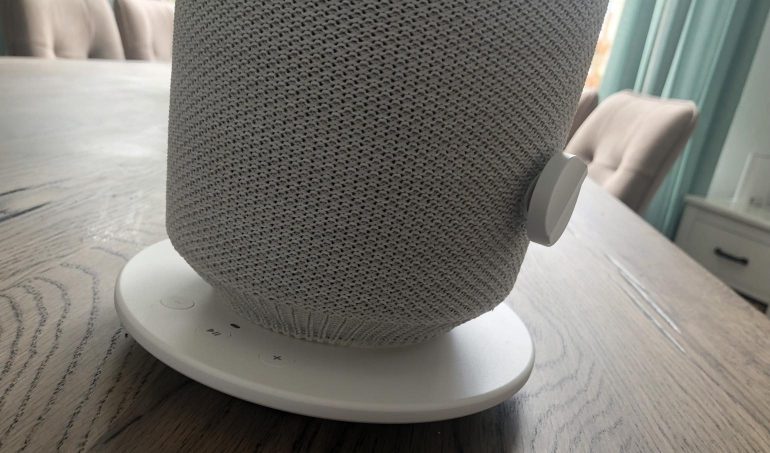 In onze optiek is de zwarte variant wat chiquer en stijlvoller, maar door de zwarte kleur van de kap lever je wel wat in op de helderheid van de lamp. Aan de zijkant van de tafellamp-speaker zien we nog een draaiknop terug. Deze ietwat grote (en in onze optiek niet bijzonder mooie) knop laat je de lamp aan- en uitzetten. Helaas geeft de knop geen mogelijkheid om de lamp te dimmen, wat een gemiste kans is. Natuurlijk kun je er wel een slimme lamp (bijvoorbeeld van IKEA) indraaien waardoor je de lamp alsnog kunt dimmen. Ook de tafellamp-speaker is bijzonder netjes afgewerkt.