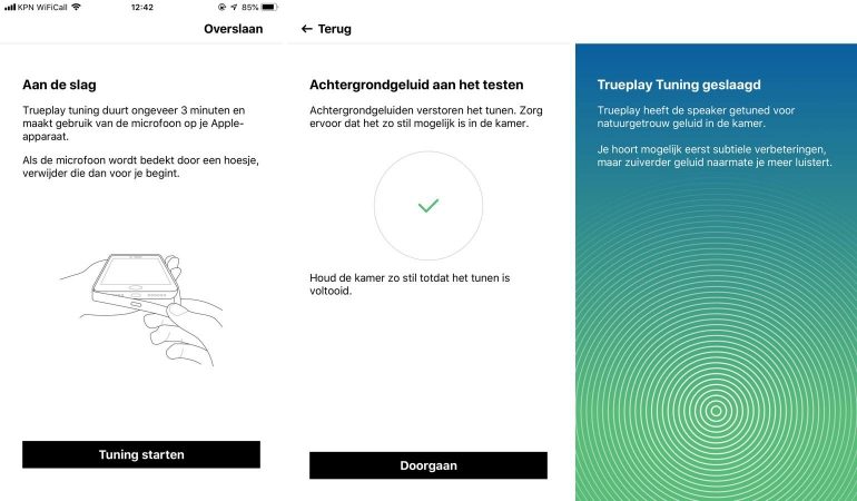 Dat er Trueplay opzit maakt de plaatsing van de tafellamp-speaker en boekenplank-speaker ook wat eenvoudiger. De tafellamp-speaker is wat gevoeliger voor waar je hem plaatst maar wanneer de plaatsing niet optimaal is kun je dit aardig corrigeren met Trueplay. De boekenplank-speaker is zoals gezegd ook verticaal, in een kast en tegen de wand of een rek te plaatsen. Als je de speaker als plankje gebruikt kun je er tot 3 kilogram aan objecten op plaatsen. Samen met de muurbeugel wordt een matje geleverd waardoor objecten op stabiel op de speaker blijven staan.