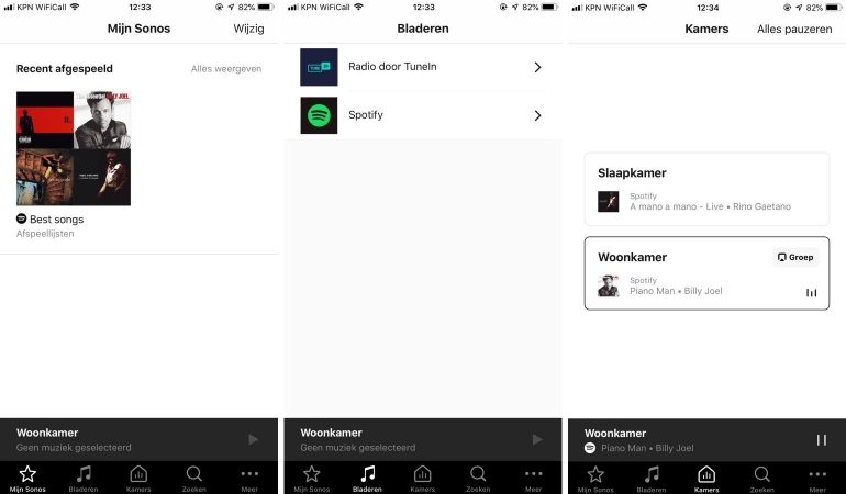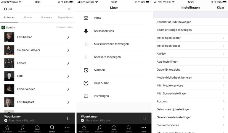 In de Sonos app heb je verschillende tabs waarmee je toegang krijgt tot muziek en diverse functies. De eerste tab is ‘Mijn Sonos’ waar je een overzicht krijgt van recent afgespeelde muziek en als favoriet opgeslagen muziek. De tab ‘Bladeren’ geeft je toegang tot de gekoppelde diensten of lokale media) waarbinnen je kunt bladeren naar de gewenste muziek. In de tab ‘Kamers’ zie je de speakers die per ruimte gekoppeld zijn. Klik op een ruimte en je kunt direct de muziekweergave aanpassen. De vierde tab is ‘zoeken’ waarmee je binnen alle gekoppelde diensten en bronnen kunt zoeken. En tot lot kun je bij ‘Meer’ de instellingen aanpassen. Hier kun je speakers toevoegen, muziekdiensten toevoegen, alarmen instellen en toegang krijgen tot de algemene instellingen. Bij de algemene instellingen kun je per ruimte en speaker nog aanpassingen doen, waaronder het aanpassen van namen, het uitvoeren van Trueplay tuning en het aanpassen van de equalizer. Ook vind je hier instellingen voor het beheren van de lokale muziekbibliotheek, de muziekdiensten en het ouderlijk toezicht.