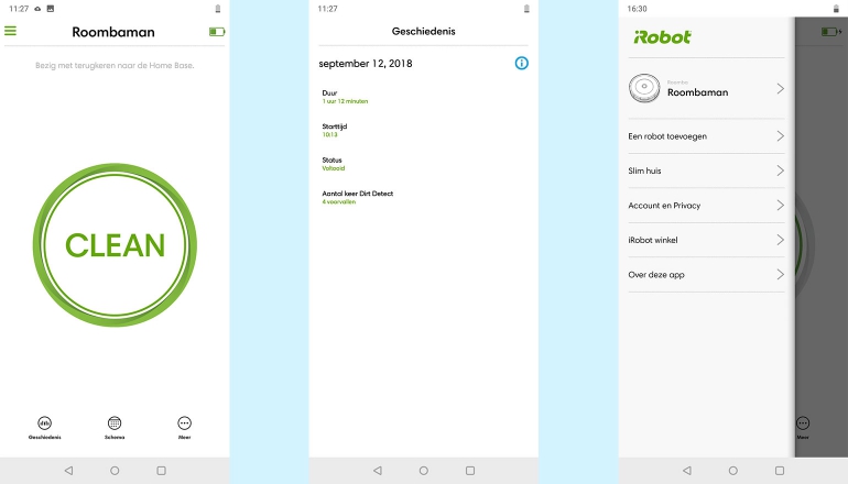 De Roomba-stofzuigers zijn voorzien van een modern ogende en opgeruimde applicatie. De software zet de belangrijkste onderdelen van de robotstofzuiger centraal. Wanneer je de app opent, na het installeren en het volgen van de stappen op het scherm, dan zie je meteen de knop CLEAN in beeld staan. Druk daarop en de stofzuiger gaat meteen aan de gang. Daaronder tref je knoppen aan voor het schema en de geschiedenis. De schemaknop geeft je de mogelijkheid de stofzuiger op vaste tijden en dagen het huis schoon te laten maken.
