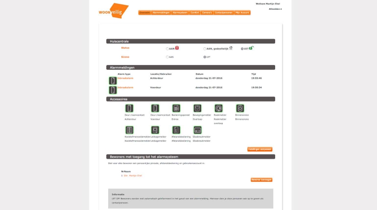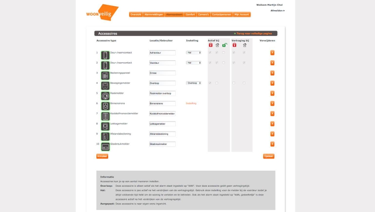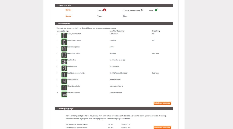 Ook kun je aangeven welke sensoren geactiveerd worden bij een ‘deels’ alarm, een alarm waarmee bijvoorbeeld alleen de voordeur en achterdeur beveiligd worden zodra je naar bed gaat. De portal is dé plek om contactpersonen en bewoners aan te passen, contactgegevens aan te passen en om de instellingen van de afzonderlijke producten binnen je beveiligingssysteem aan te passen. Let op; dit kan alleen in de online portal, niet in de app.