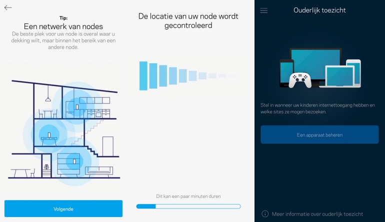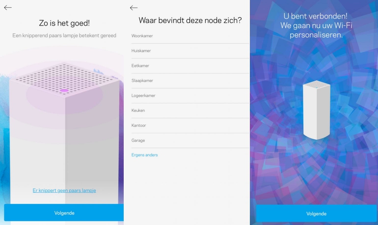 Vervolgens gaan we met de Linksys-app aan de slag, en om maar meteen met de deur in huis te vallen; dit is een verademing om mee te werken. Aangezien wij geen technici op het gebied van netwerken zijn is een snelle en duidelijke installatie een must, en gelukkig biedt de app dat in alle opzichten. De set-up is kinderlijk eenvoudig dankzij het doorlopen van een aantal duidelijke en simpele stappen. Zo maak je een account aan, stel je een nieuw apparaat in, koppel je de stroomtoevoer, koppel je de ethernetkabel met de eerste node, geef je het WiFi-netwerk een naam en wachtwoord mee en sluit je de installatie af. Een kind kan de was doen. Als de basismodule geplaatst is kun je andere units gaan toevoegen en het mooie is dat de app direct aangeeft of deze unit dicht genoeg bij de basismodule staat om voor een goed netwerk te zorgen.