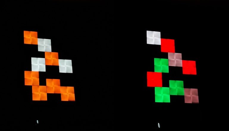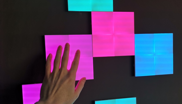 De vierkante led-panelen bieden geen egale kleur. Sterker nog, ieder paneel is eigenlijk in vier vlakken onderverdeeld. Ieder vlak heeft daarnaast lichtere delen en donkere delen. Beoordeel je ieder paneel op slechts een enkel vlak, dan lijkt het eigenlijk helemaal niet zo mooi. Wanneer je echter alle panelen aan hebt staan dan ontstaat er iets magisch in huis. Juist doordat de panelen geen egale kleur bieden ontstaat een hypnotiserend effect, die verder versterkt kan worden door te spelen met de verschillende kleureffecten in de app.