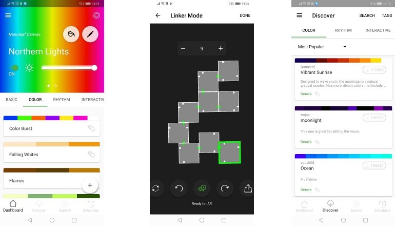 Beoordelen we de Nanoleaf Canvas puur als slimme verlichting, dan doe je dit apparaat eigenlijk tekort. Je kunt de panelen normaal wit licht door het huis laten schijnen, en dit kan tevens behoorlijk fel, maar kijken naar negen vierkante panelen met wit licht is niet bepaald sfeerverhogend. De Nanoleaf Canvas komt pas echt tot zijn recht wanneer je speelt met de kleurovergangen en effecten. Ieder paneel van vijftien bij vijftien centimeter kan 16,4 miljoen kleuren laten zien. Net als bij andere slimme verlichting zul je de ruim zestien miljoen verschillende kleuren natuurlijk nooit in de praktijk kunnen onderscheiden. Toch komen de verschillende tinten rood, blauw of bijvoorbeeld roze duidelijk verschillend over. Alles is aanpasbaar via de zeer gebruiksvriendelijke app van Nanoleaf, of je nu een effect kiest of juist één kleur op de panelen wilt laten zien.