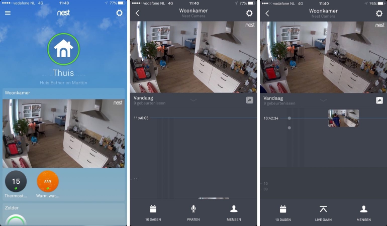 De verbinding komt snel tot stand en je kunt direct met de camera aan de slag. In de Nest-app kun je aangeven voor welke ruimte de camera bedoeld is, iets dat met name handig is wanneer je meerdere camera’s hebt hangen. In het homescherm van de app krijg je direct vensters van alle camera’s te zien. Zo heb je een goed overzicht van je hele huis.