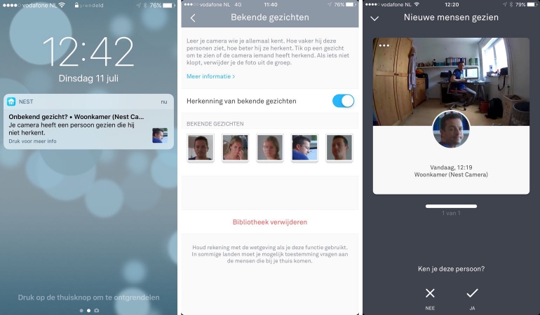 Met een abonnement op Nest Aware (eerste 30 dagen gratis op proef) kun je dit uitbreiden met bekend-gezicht meldingen. Dit zijn meldingen over wie er in je huis is, bijvoorbeeld de naam van een gezinslid, de oppas of een onbekende. Hiervoor moet je bekende gezichten wel identificeren in de Nest-app. Met een abonnement krijg je daarnaast ook intelligente geluidsmeldingen. Deze meldingen brengen je op de hoogte van gebeurtenissen buiten beeld, zoals mensen die praten of blaffende honden.