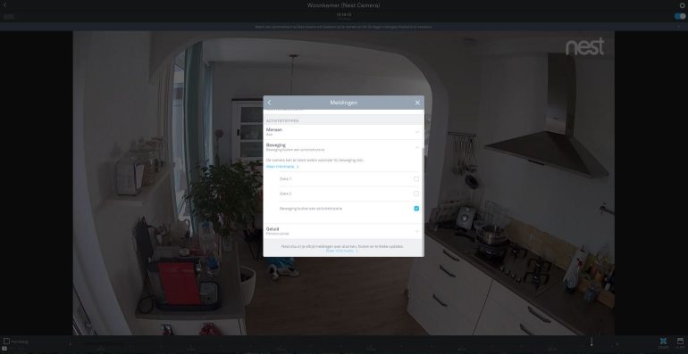 Ook voor meldingen en geluiden/audio zijn er diverse instellingen. Zo kun je een kort geluidssignaal laten afspelen als je iets via de camera wilt zeggen, kun je de microfoon dempen of uitzetten en kun je aangeven waar (mobiel en tablet of e-mail) je meldingen wilt ontvangen wanneer er een beweging, een persoon (alleen bij de Nest Cam IQ als standaard) of een geluid gedetecteerd wordt. Mocht je extra zones hebben aangemaakt dan kun je aangeven of er alleen meldingen mogen komen als er iets in die zone gebeurt.