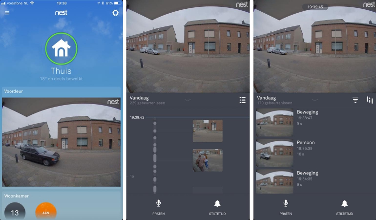 Zodra de Hello gemonteerd en geïnstalleerd is krijg je op het homescherm van de Nest-app direct een live-beeld te zien van wat er voor je deur gebeurt. Klik je op dit beeld dan kom je in de tijdslijn van de camera en hoor je ook het geluid. Onder het live beeld zie je de laatste activiteiten, die je terug kunt kijken als je een abonnement neemt. Je kunt deze in de vorm van een lijst of een tijdslijn weergeven. De camera neemt met abonnement continu op dus het wordt een volle tijdslijn, maar dankzij duidelijke thumbnails is het scrollen eenvoudig en snel. In hetzelfde venster kun je direct via de camera praten of de deurbel dempen (op stil zetten) voor een korte periode. Helaas mist er in de app een optie om de deurbel te dempen / muten voor een lange periode, bijvoorbeeld in de nacht. Die optie is voor velen toch gewenst.