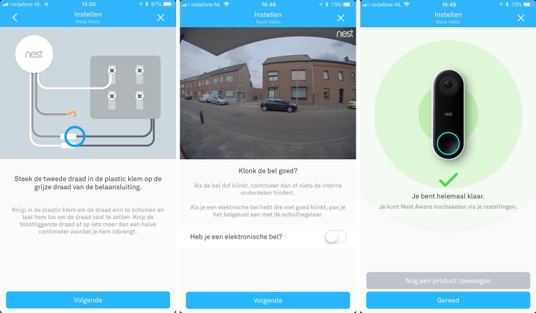 Als de deurbel hangt dan is het een kwestie van de Nest-app openen (of downloaden en een account aanmaken), de QR-code in de verpakking scannen, de app zijn werk laten doen en het beestje een naam geven. Overigens kun je ook alle stappen voor installatie via de app doorlopen, mocht je zelf aan de slag gaan. Je wordt echt bij de hand genomen, wat een pluspunt is. De Hello verschijnt vervolgens in de app, waarna je direct beeld hebt en met de instellingen aan de slag kunt.
