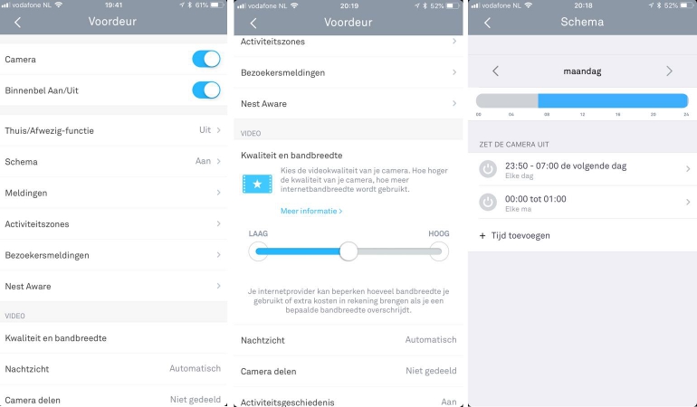 Rechtsboven in het scherm zie je een knop voor de instellingen. Hier kun je onder meer de camera in- of uitschakelen, de binnenbel in- of uitschakelen (de aangesloten gong dus), een schema aanmaken voor momenten dat de camera uit moet staan, zones aanmaken, de kwaliteit van het beeld (resolutie) instellen, de microfoon in- of uitschakelen en instellen welke meldingen je wilt ontvangen.