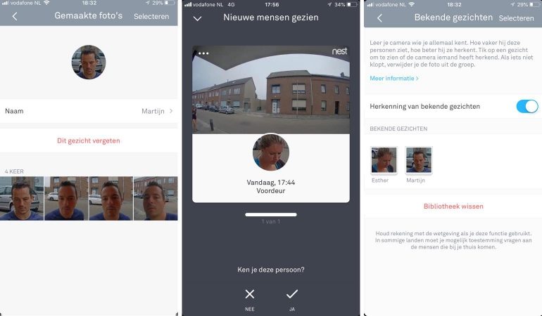Dit geldt ook voor de persoonsherkenning; zelfs iemand die snel voorbij fietst wordt als persoon herkend en daarvan krijg je dan ook direct een melding. Je kunt met een abonnement zelfs zover gaan om aan te geven of je een persoon herkent. Nest vraagt je of de persoon die gezien is een bekende of onbekende is. Nadat je dat een paar keer gedaan hebt leert de Nest Hello dus wie er voor de deur staat. Wellicht je vrouw, je schoonmoeder of de koerier. Je kunt ook specifieke namen aan gezichten hangen, waarna Nest het je laat weten wanneer deze specifieke persoon voor de deur staat. Het leren kennen van een persoon (de naam koppelen) aan een gezicht duurt even aangezien de lichtinval of gezichtsuitdrukking vaak verschilt. Helaas kun je aan de hand van bekende of onbekende personen de meldingen niet aanpassen; bijvoorbeeld ‘geen melding wanneer Esther voor de deur staat’. Wat betreft deze slimme features loopt Nest voorop, dat moet gezegd worden. En eigenlijk kunnen we dus zeggen dat de Hello zowel een slimme deurbel als een slimme beveiligingscamera is.