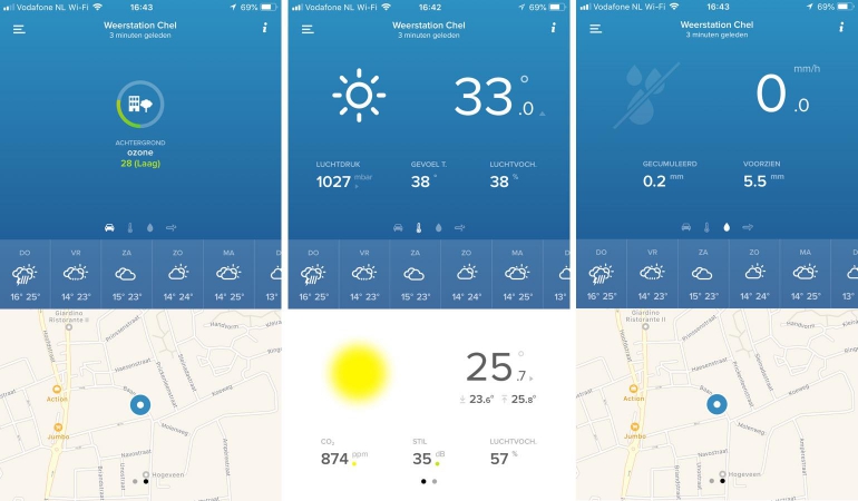 De Netatmo-app voor het Personal Weather Station is een strak vormgegeven en goed werkende applicatie. Het homescherm is eigenlijk direct het belangrijkste scherm want hier vind je alle informatie over het klimaat binnen en buiten. Je ziet voor binnenhuis de huidige temperatuur, de kwaliteit van de lucht (CO2-meting, aangegeven met een groene, gele, oranje of rode gaswolk), het aantal decibel aan geluid en de luchtvochtigheid.