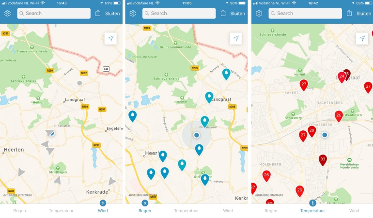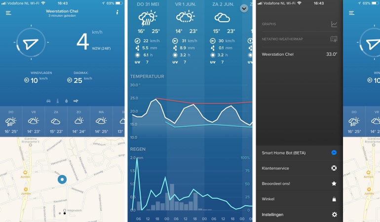 Vanuit de linkerzijde kun je een menu oproepen. Via dit menu krijg je toegang tot onder meer de grafieken, de instellingen en de ‘weathermap’. Deze weathermap is een kaart met alle sensoren die er in jouw omgeving hangen. Je kunt dus eenvoudig vergelijken met andere Netatmo-gebruikers in de omgeving, en zodoende ook het weer iets beter voorspellen. Ook heb je via het menu toegang tot de Smart Home Bot, wat eigenlijk een bot is die via Facebook Messenger werkt en je op commando de metingen kan voorschotelen. Daarnaast kan deze bot andere Netatmo-producten voor je bedienen, zoals de camera en de thermostaat. Eerlijk gezegd hebben wij dit niet gebruikt, want even de app openen voor meer informatie is sneller dan via Messenger een vraag typen.