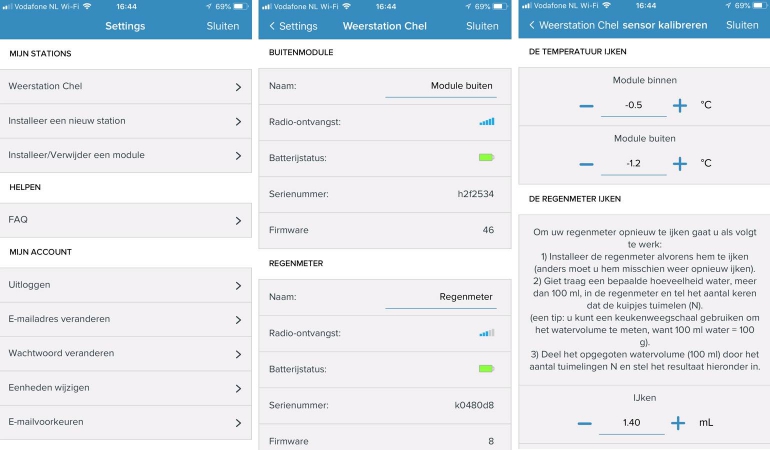 Overigens zijn diverse sensoren ook te kalibreren. Zo kun je bijvoorbeeld de temperatuurmeting van de binnenmodule ijken als deze niet helemaal overeenkomt met de werkelijke temperatuur. Ook kun je de hoogte van de windmeter instellen om te compenseren als deze lager dan 10 meter hangt, en kun je de regenmeter kalibreren om zo accuraat mogelijk het aantal millimeter vast te stellen. Dat laatste doe je door 100ml water rustig in de regenmeter te gieten en het aantal kantelingen van de bakjes te tellen. Deel het aantal milliliter door het aantal kantelingen en vul dat getal in, in de app.