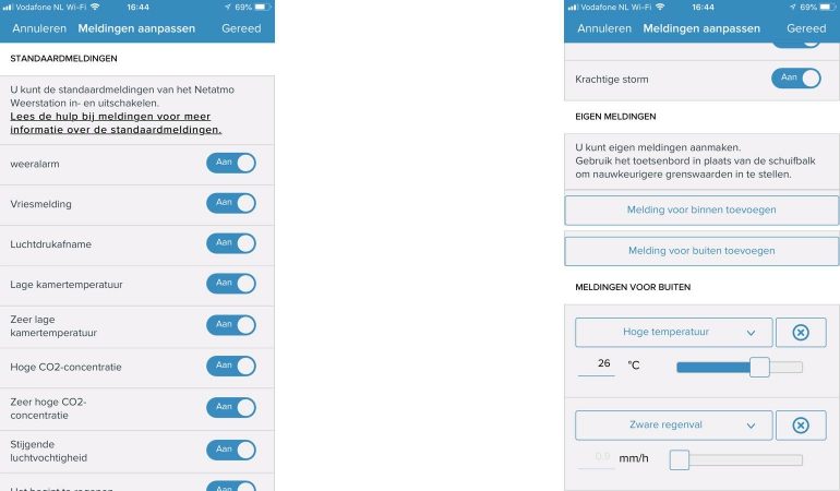 De meldingen staan standaard aan, onder meer voor als het begint te regenen, als het CO2-gehalte boven een bepaalde norm komt en als het begint te vriezen. Er zijn zo meer dan 10 standaard meldingen die je kunt activeren of deactiveren, maar je kunt er zelf ook aanmaken. Je kunt handmatig meldingen voor binnen of buiten toevoegen, aan de hand van de verschillende metingen die gedaan worden.