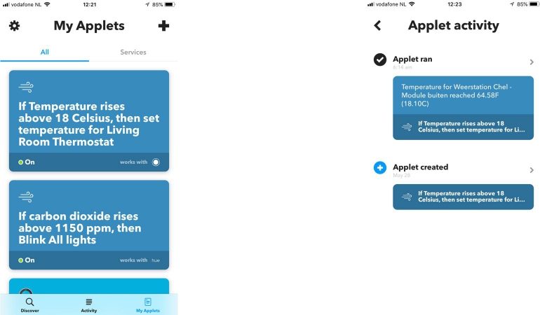 Gelukkig is er ook IFTTT-ondersteuning aanwezig. Dit houdt in dat je de metingen als actie kunt inzetten. Via de IFTTT-app of -website kun je bijvoorbeeld de Philips Hue-lampen rood laten kleuren zodra het CO2-niveau te hoog wordt. Ook kun je de Nest-thermostaat uit laten zetten zodra de temperatuur boven een bepaald niveau komt. Dit is erg handig en werkt goed, maar houd er dus wel rekening mee dat er een vertraging van 10 minuten in kan zitten door het om de 10 minuten verversen van de data in de app. Dat maakt IFTTT voor bijvoorbeeld de garagedeur sluiten als het veel regent wellicht niet heel handig.