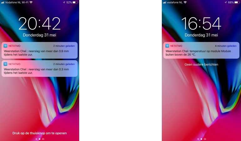 Afgezien van de directe melding over de beginnen de regen doen de meldingen precies wat je ervan mag verwachten. Zodra een bepaalde waarde van een van de sensoren bereikt wordt krijg je een notificatie op je smartphone. Niet meer en niet minder. Ze zijn echter compleet afhankelijk van of de sensor iets meet, en de maximaal 10 minuten vertraging door de verversingstijd van de app. Graag hadden we een optie gezien om direct nieuwe data op te vragen of de verversingstijd te passen. De regenmeter met de melding over de beginnende regen is hierop de uitzondering maar die werkte in ons geval (nog) niet.