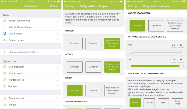 Het tandwiel links in het scherm geeft toegang tot alle instellingen van de app. Binnen de optie ‘Beheer mijn huis’ kun je onder meer de locatie, naam en regio aanpassen, de kamers/ruimten benoemen en indelen, en de koppeling met Apple HomeKit leggen. Bij de ‘Veiligheidsinstellingen’ kun je de notificaties aanpassen. Per soort melding (mens, dier, auto en anders) kun je aangeven of er een melding moet verschijnen en of er opgenomen moet worden. Daarbij kun je middels een schema aangeven wanneer de camera dit mag uitvoeren. Tot slot kun je hier aangeven hoelang opnamen bewaard moeten blijven. Bij de ingebouwde microSD-kaart van 8GB is één week aan te raden aangezien de kaart anders snel volraakt. Wil je opnamen ook nog opslaan in Dropbox of op een FTP server dan kan dit via de optie ‘Cloud Opslag’. Daarnaast kun je via het instellingenmenu gasten beheren. Hier kun je gebruikers toevoegen die toegang mogen hebben tot de gekoppelde producten en hun notificaties. Tot slot kun je via de instellingen nieuwe producten toevoegen, je account aanpassen en een aantal tips bekijken.