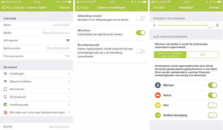 Zo kun je bij instellingen (wat verwarrend) het beeld van de camera draaien, de microfoon in- of uitschakelen en een beveiligingscode aanmaken voor het onderbreken van de bewaking. Bij ‘Alert-zones’ kun je specifieke gebieden in het beeld selecteren waarbinnen bewegingen waargenomen mogen worden, bijvoorbeeld een deur of een deel van de tuin. Tot slot kun je de schijnwerper aanpassen. Je kunt de helderheid naar eigen wens instellen en ervoor kiezen de schijnwerper bij specifieke meldingen of altijd in te schakelen.