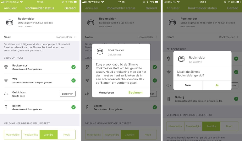 Daarbij kun je nog in het statusmenu van de rookmelder duiken door het icoontje van de rookmelder op het homescherm ingedrukt te houden. In het menu dat dan opent kun je zien wanneer de status voor het laatst is bijgewerkt, wanneer de rooksensor door het apparaat zelf gecontroleerd is, wanneer de wifi-verbinding gecontroleerd is en hoe het met de batterij staat. Je kunt ook zelf een geluidstest doen en instellen wanneer je eraan herinnerd wilt worden om deze test te doen. Tot slot kun je de rookmelder binnen de Netatmo Security-app samenvoegen met camera’s van het merk, en je kunt de rookmelder koppelen met Apple HomeKit waardoor je ook je verlichting of andere met HomeKit-compatibele producten op de rookmelder kunt laten reageren. Helaas is de integratie van de Google Assistent nog niet aanwezig.